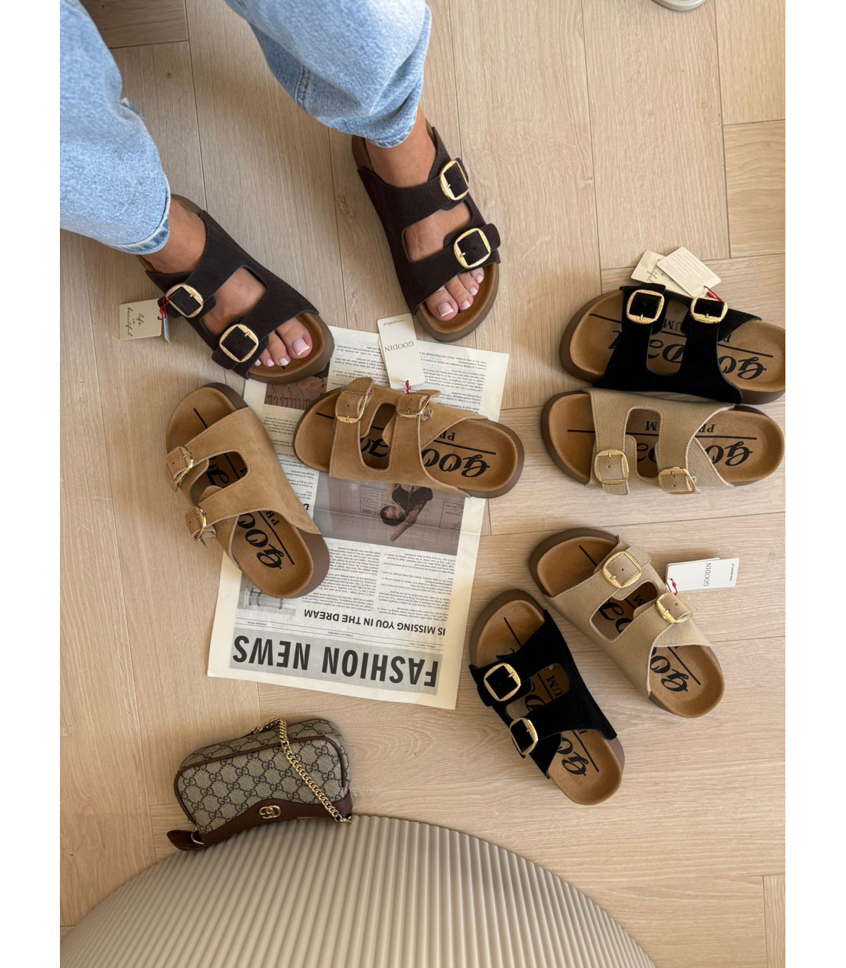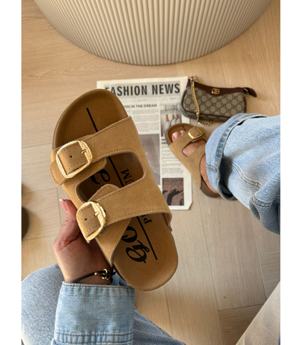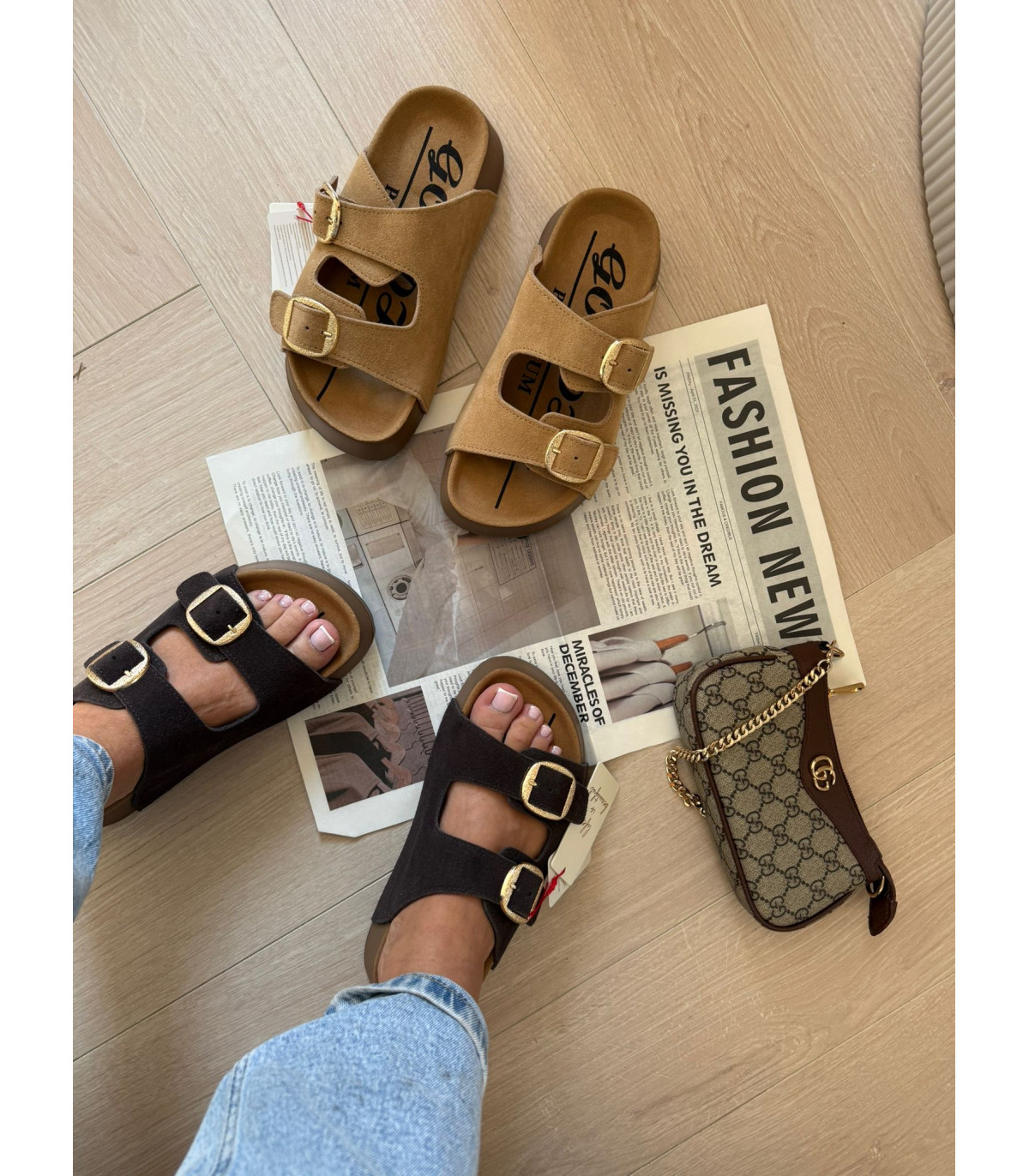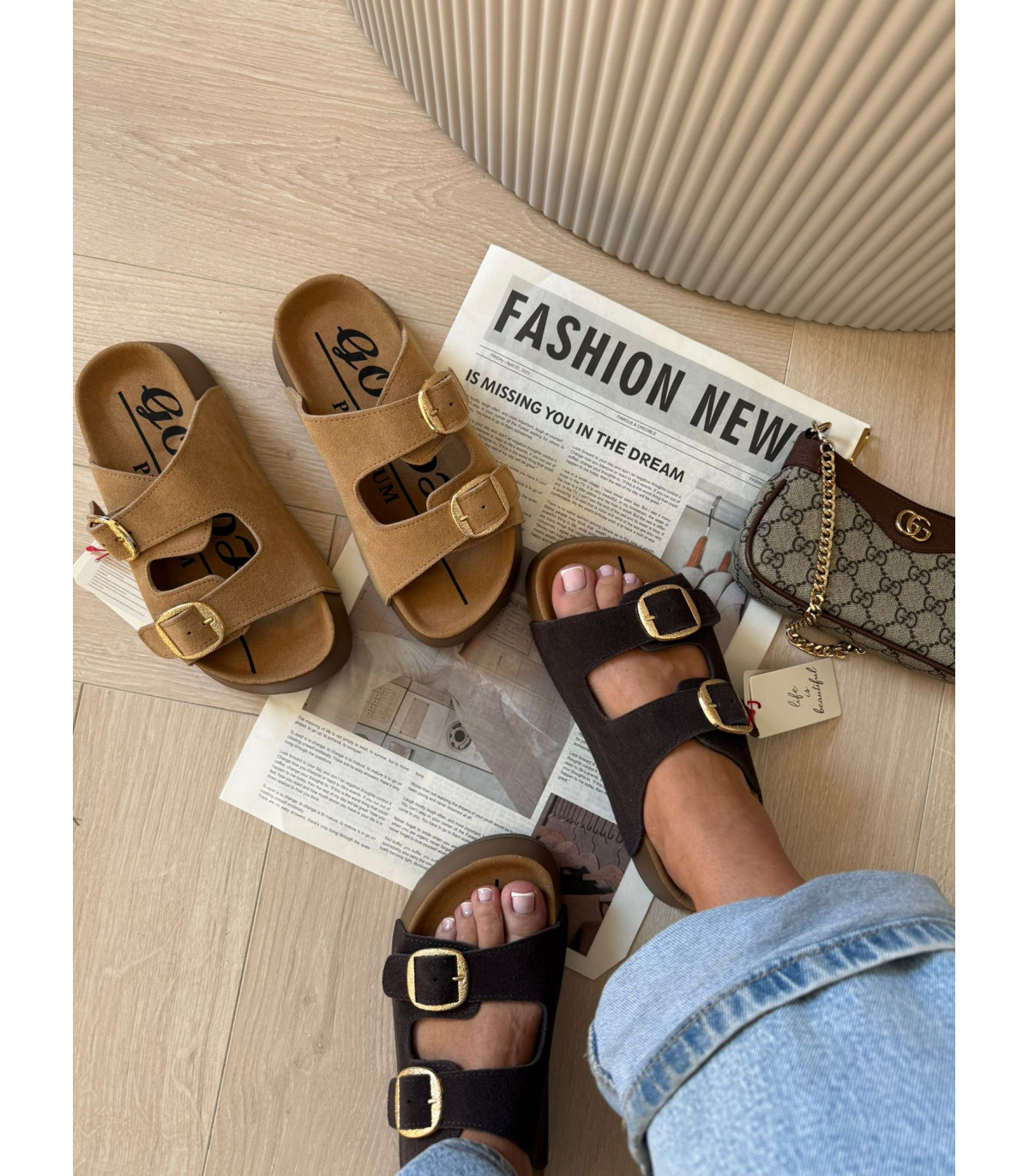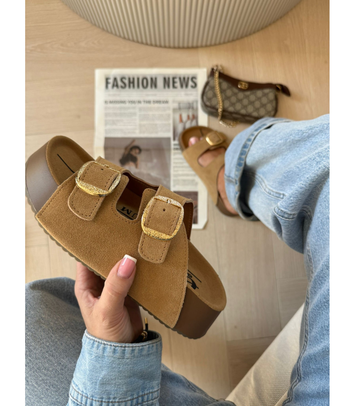 Skórzane Klapki Na Platformie Brąz